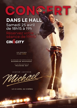 Réservez votre place le 𝘀𝗮𝗺𝗲𝗱𝗶 𝟮𝟱 𝗮𝘃𝗿𝗶𝗹 à 𝟭𝟵𝗵𝟭𝟬 et venez assister à un hommage unique à 𝗠𝗜𝗖𝗛𝗔𝗘𝗟 𝗝𝗔𝗖𝗞𝗦𝗢𝗡 avec un 𝗰𝗼𝗻𝗰𝗲𝗿𝘁 𝗲𝘅𝗰𝗹𝘂𝘀𝗶𝗳 de 𝟭𝟴𝗵𝟭𝟱 à 𝟭𝟵𝗵. ------ Film disponible en salle dès le Mercredi 22 Avril ------ • 𝗦𝘆𝗻𝗼𝗽𝘀𝗶𝘀 : Michael dresse le portrait cinématographique de la vie et de l’héritage de l’un des artistes les plus influents de notre époque. Le film raconte l’histoire de Michael Jackson au-delà de la musique, depuis la découverte d’un talent hors du commun en tant que leader des Jackson Five, jusqu’à l’artiste visionnaire dont l’ambition créative a alimenté une quête incessante pour devenir le plus grand artiste au monde. Mettant en lumière sa vie hors scène et ses performances les plus emblématiques de ses débuts en solo, le film offre au public une place au premier rang pour découvrir Michael Jackson comme jamais auparavant.